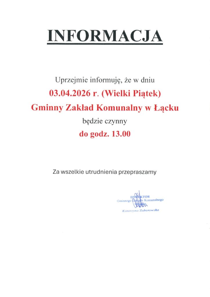 Dyrektor Gminnego Zakładu Komunalnego w Łącku, uprzejmie informuję, że z powodu prowadzenia prac remontowych, tj. wjazdu na teren Gminnego Zakładu Komunalnego oraz Gminnego Ośrodka Pomocy Społecznej, dojazd do poszczególnych jednostek możliwy jest przez bramę wjazdową nr 1.