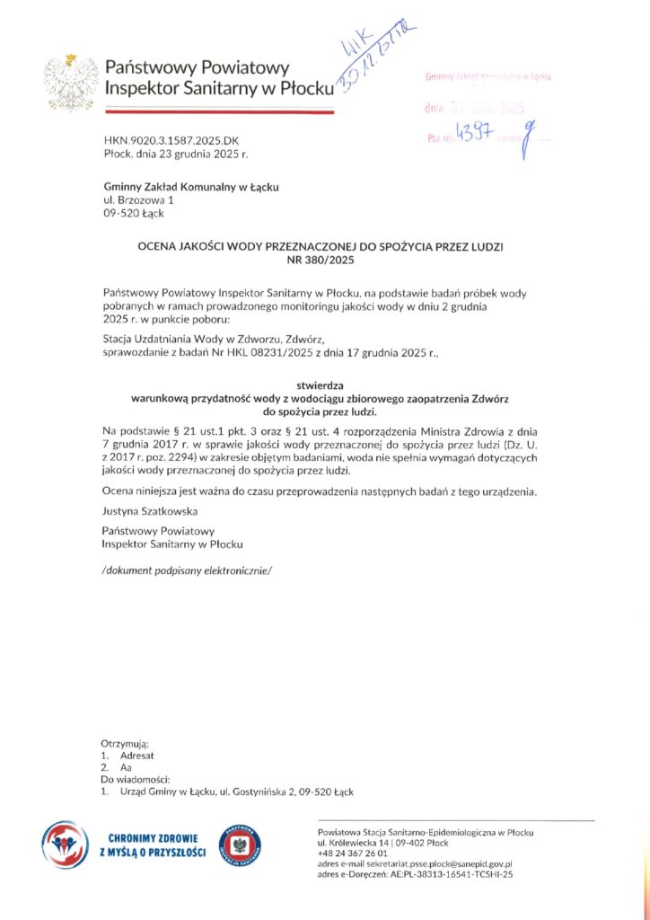 w związku z otrzymaną oceną jakości wody przeznaczonej do spożycia przez ludzi z wodociągu zaopatrzenia zbiorowego w miejscowości Zdwórz informuję, że przekroczony został parametr mangan.