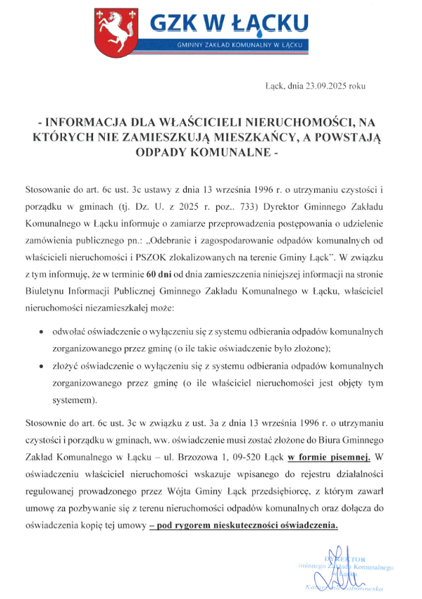 Gminny Zakład Komunalny informuje, że w ramach Umowy Nr GZK.272.02.2020 z dnia 13 stycznia 2020 r.zawartej w wyniku rozstrzygnięcia postępowania przetargowego (przetarg nieograniczony) odbiór i zagospodarowanie odpadów komunalnych od właścicieli nieruchomości i PSZOK zlokalizowanych na terenie Gminy Łąck realizuje firma EKO-MAZ Sp. z o. o. z siedzibą w Płocku przy ul. Gierzyńskiego 17, 09-407 Płock.